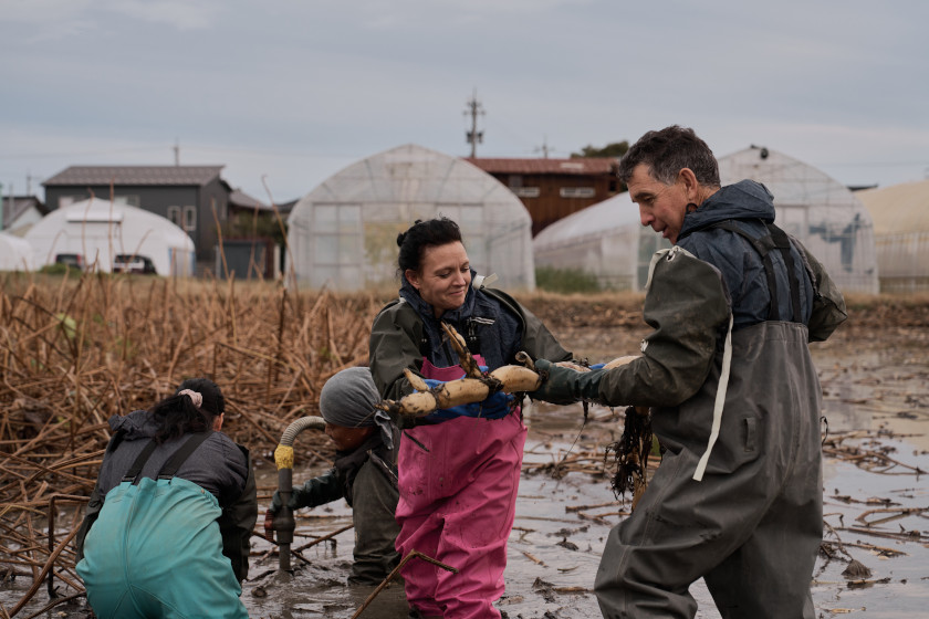 次に訪れたのは、あわら市の「グリーンファーム角屋」。米や青大豆、玉ねぎとともに、県内では珍しいレンコンを栽培しています。ファニー・レイ氏とフランク・ランギーユ氏は、泥の畑に入ってレンコン掘りに挑戦。水圧を使いながら折れやすいレンコンを丁寧に掘り上げていきます。