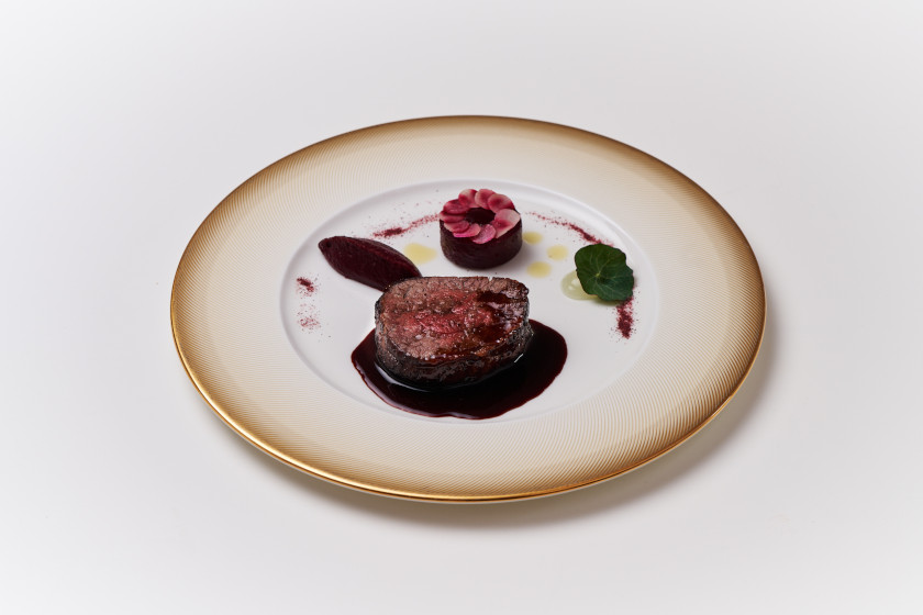 「若狭牛フィレ肉のロースト 赤ワインのスビーズ ビーツとローズマリーのジュレ」