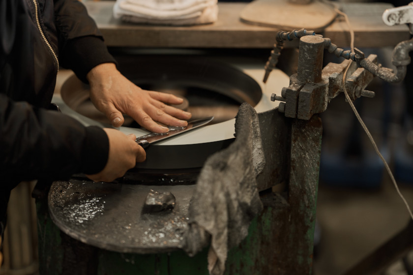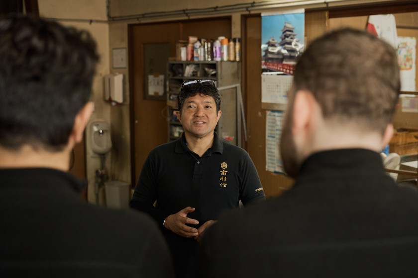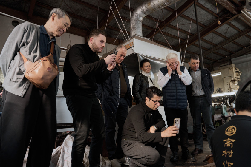 最後に訪れたのは、越前打刃物の名店「高村刃物製作所」。代表・高村光一さんから「良い素材・良い鍛造と熱処理・良い研ぎ」という三つの要が包丁づくりの根幹であると説明を受けました。刃角の違い、研ぎと磨きの使い分けなど専門的な話題に、真剣に耳を傾けるシェフたち。日頃から使う道具ということもあり、質問も相次ぎました。