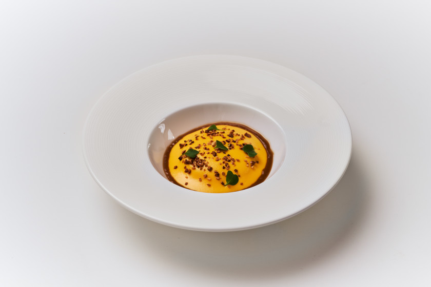 まずは、カルビン・ルオー氏が手がけた「冬野菜のミルフィーユ」が登場。こちらは、ルオー氏が今年1月に開催されたコンクールで優勝した際に作ったもので、野菜のみで構成されています。コンクールの課題となった野菜がバターナッツであったことから誕生した一皿です。