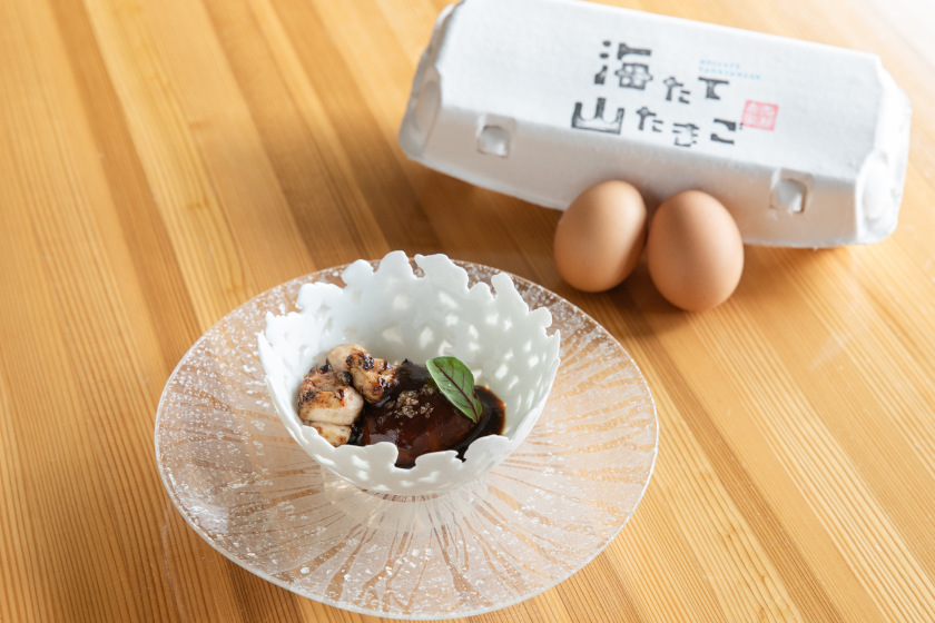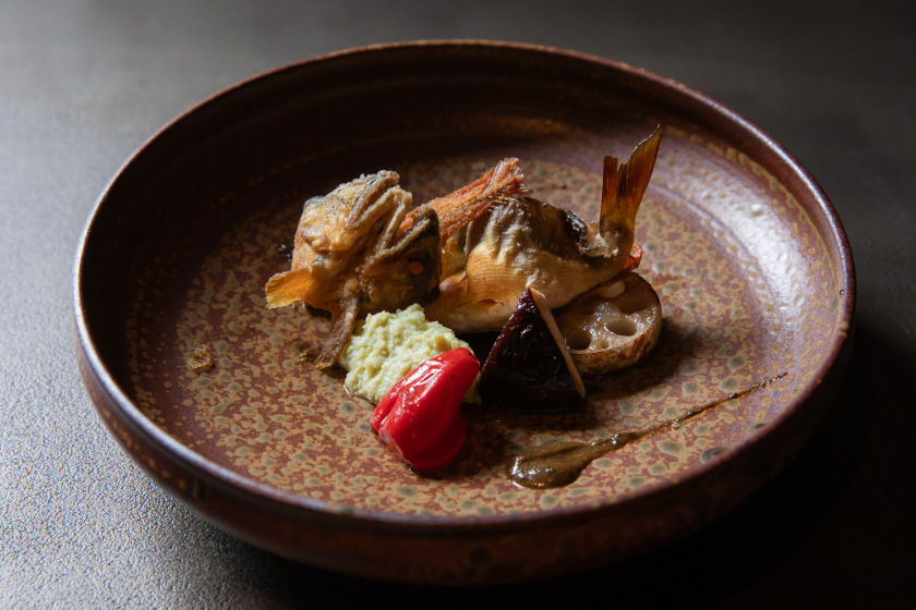 福井の山・海・里すべての恵みを起点に、まずは食材ありきで料理を組み立てています。魚介を中心に、ジビエなど興味のある素材にも積極的に向き合い、季節と土地が語る魅力を一皿に表現します。生産者とのつながりや食材との出会いを料理の核とし、出汁を大切にする日本料理の基本を守りながら、洋のエッセンスも柔軟に取り入れる。そのとき手に入る最高の食材を、そのときにしか出せない形でおいしく仕上げることを大切にしています。