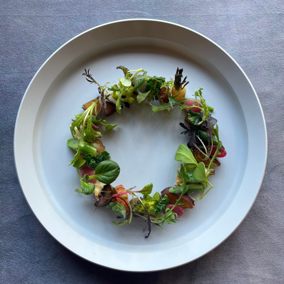 絞った要素で風味にリズムを作る皿はどれも楽しく、シェフのセンスが冴えます。「野菜のリース」は食べるほどに感覚が澄む魅力的な品。古民家を生かした内装も素敵です。