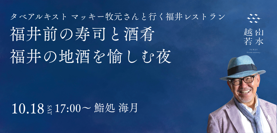 全国各地を食べ歩くタベアルキストマッキー牧元さんがご案内するのは、「福井前の寿司と酒肴、福井の地酒を愉しむ夜」。