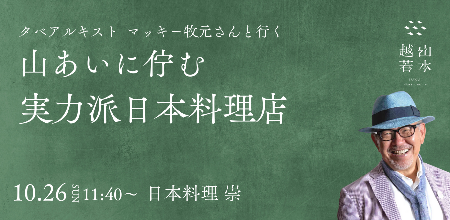 今回の皆さまをご案内するのは、テレビや雑誌でおなじみのタベアルキストマッキー牧元さん。福井を何度も訪れ、食の奥深さを探ってきたマッキーさんが「これは特別!」と注目するのが、日本料理店「崇(すう)」です。